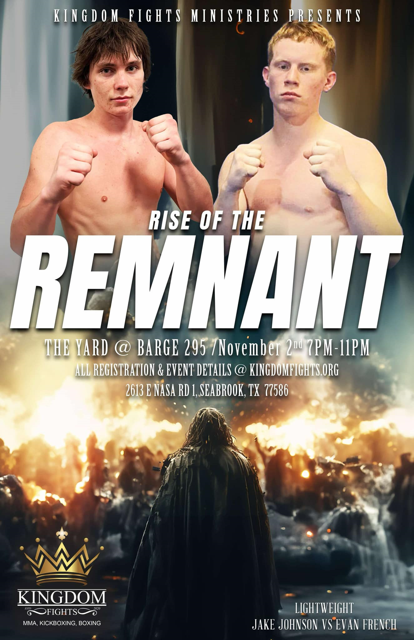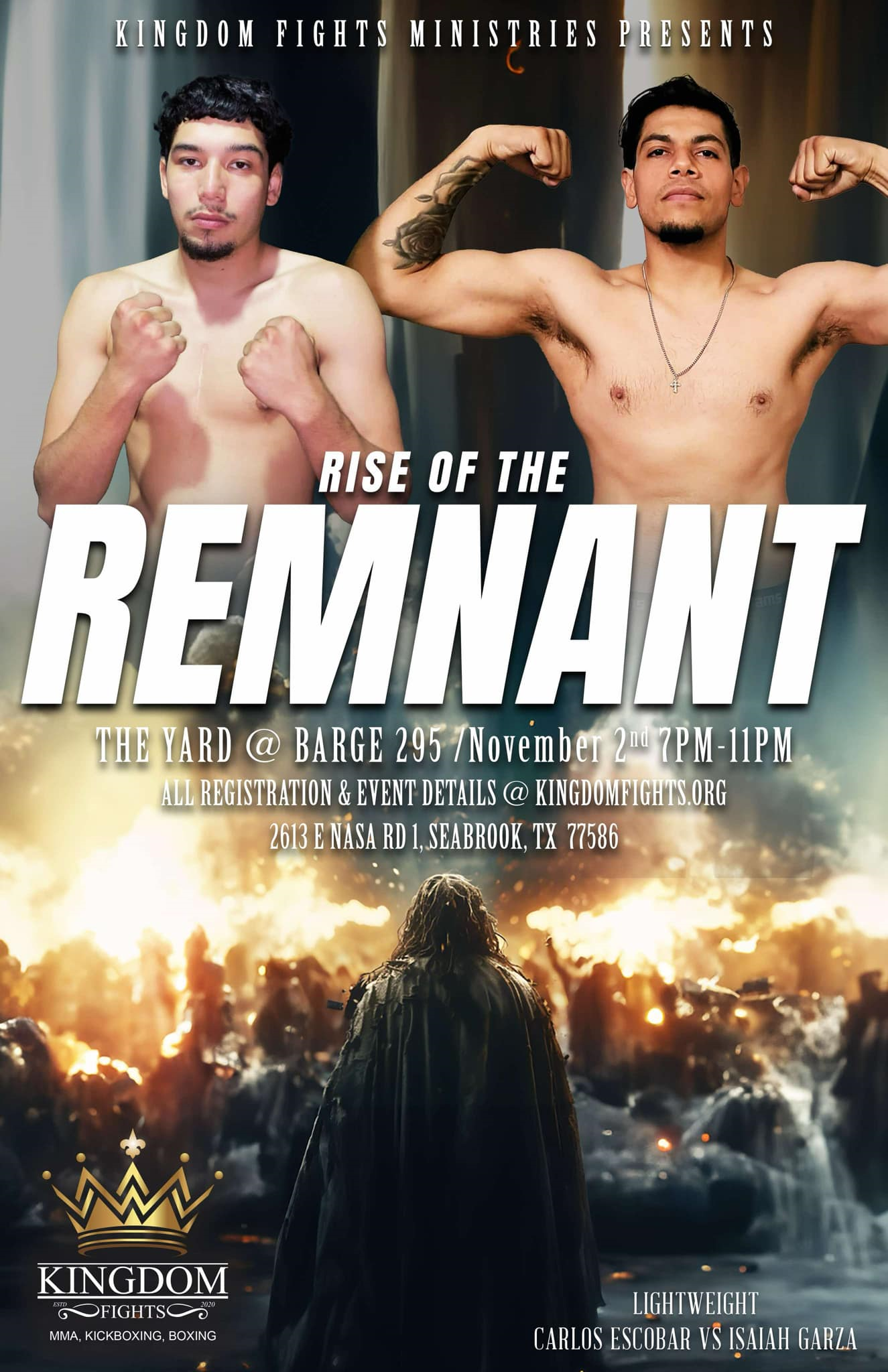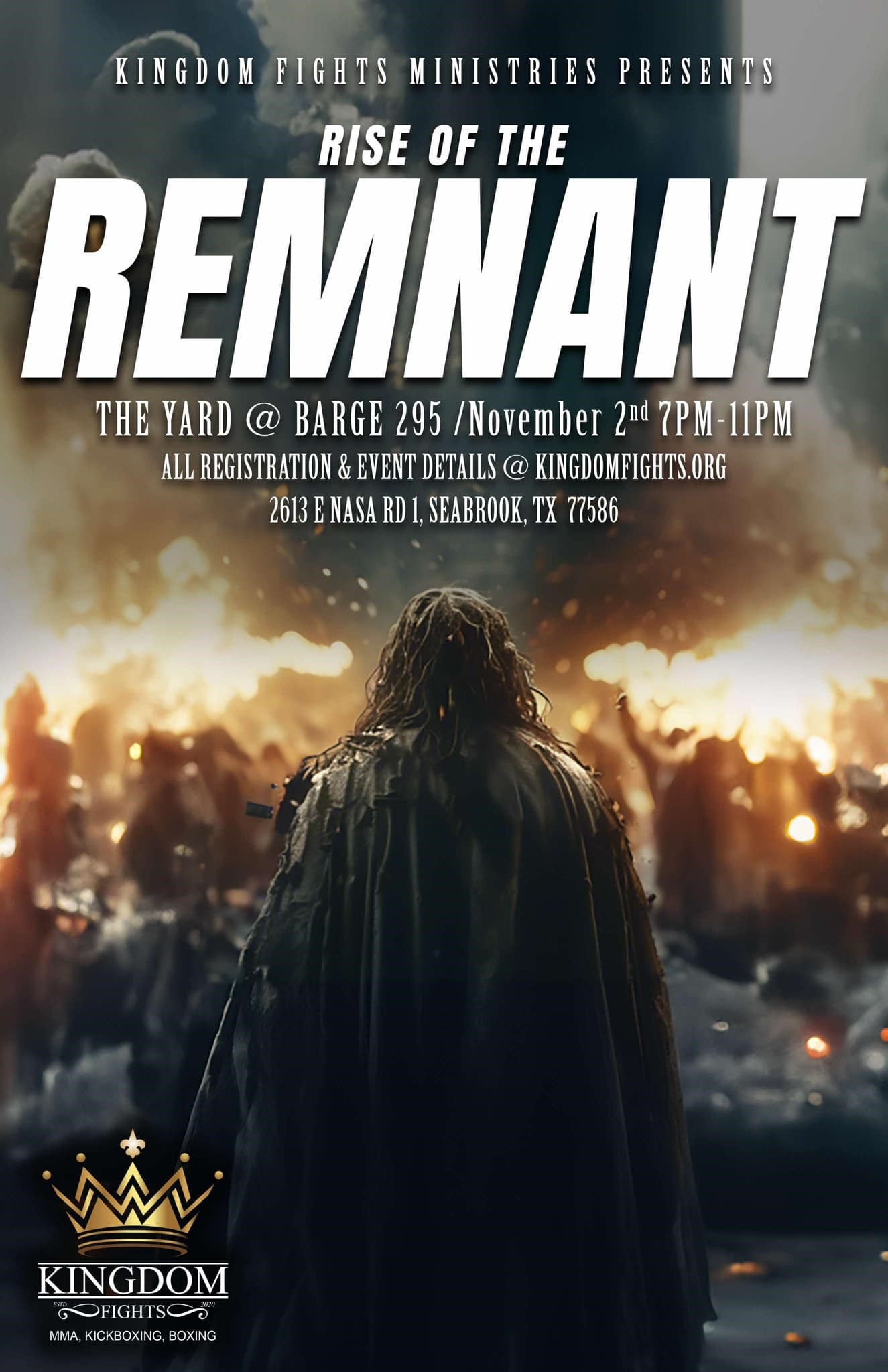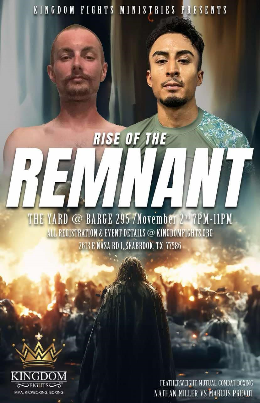 Come and join us at The Yard on NASA RD. 1 in Leauge City on November 2nd for “RISE OF THE REMNANT,” with the KINGDOM message going forth and a stacked card in the making for BOXING, MMA, KICKBOXING, BJJ, and PILLOW FIGHTING!